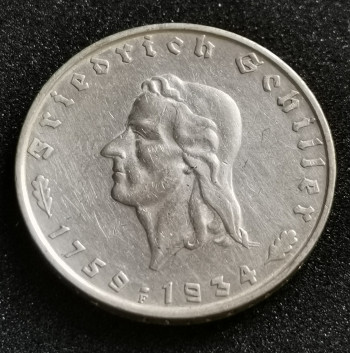 Německá 2 Reichsmarka 1934 F FRIEDRICH SCHILLER