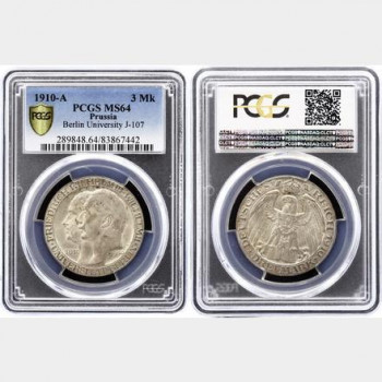 3 Marka 1910 A - Univerzita Berlín PCGS MS 64