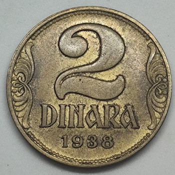 Jugoslávie 2 Dináry 1938 - Aluminium/Bronz, 5g, ø 24,5mm