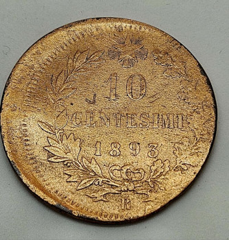 Itálie - 10 Centisimi 1893 - Měď, 9,55g, 30mm - Chyboražba RR!