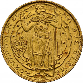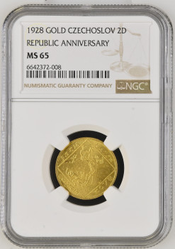 Dvoudukátová Au medaile Jsem ražen s Českého kovu - NGC MS64 - 1928 (O. Španiel) - 10. výročí vzniku republiky. Český lev ve štítě, nad ním kníže Václav v čele Blanických rytířů / Sv. Prokop orá s čertem. Au 22 mm (6,89 g)