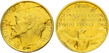 Dukátová medaile 1932 Miroslav Tyrš - NGC MS 62, 20mm, 3,5g, Au 987/1000, autor: J.Brůha, hrana vroubkovaná, raženo 1742 kusů Hledaná ČSR medaile! Zlatá medaile 1932 (Dukát), Dr. Miroslav Tyrš. K výročí narození zakladatele Tělocvičné jednoty Sok