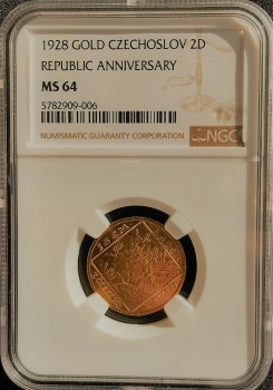 Dvoudukátová Au medaile Jsem ražen s Českého kovu - NGC MS64 - 1928 (O. Španiel) - 10. výročí vzniku republiky. Český lev ve štítě, nad ním kníže Václav v čele Blanických rytířů / Sv. Prokop orá s čertem. Au 22 mm (6,89 g)