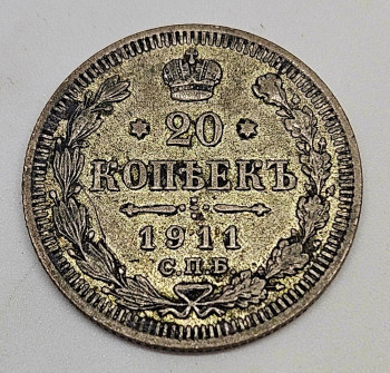 Rusko 20 Kopějka 1911, Ag 500/1000, 3,6g