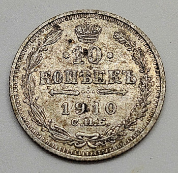 Rusko 10 Kopějka 1910, Ag 500/1000, 1,8g