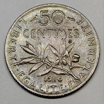 Francie - 50 Centimes 1918 - Ag 835/1000, 2,5g, 18,1mm