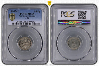 Německo - Empire 5 Pfennig 1907 J PCGS MS66 - POP TOP - Nejvyšší možné hodnocení!