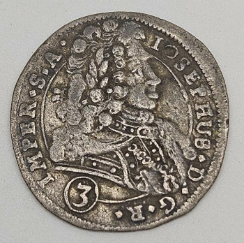 Josef I. - 3 Krejcar - groš 1711 - Mincovna Kutná Hora - Mincmistr Bemhardt Wohnseidler - Ag - 20-22mm cca 1,6g
