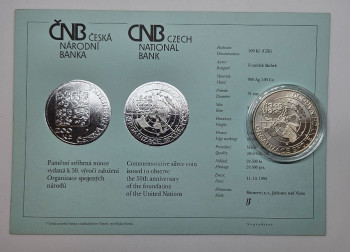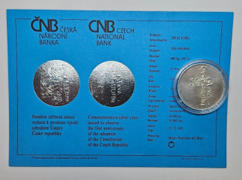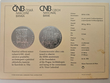ČNB 200Kč 1994 - 650. výročí založení praž. arcibiskupství a položení základního kamene ke katedrále Sv.Víta - 31mm, 13g, Ag 900/1000, B.K. - mince v plastové etue+certifikát viz.foto.