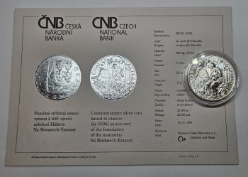 ČNB 200Kč 1997- 650. výročí narození založení kláštera Na Slovanech - Emauzy, 31mm, 13g, Ag 900/1000, B.K. - mince v plastové etue+certifikát viz.foto.