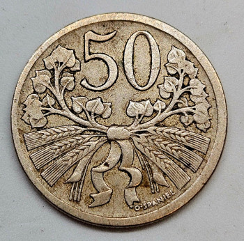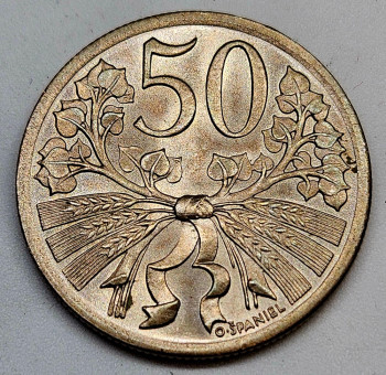 ČSR 50 haléř 1925 - vzácný ročník CuNi 80/20 materiál, 5g váha, 22mm průměr. Autor: O.Španiel, hrana vroubkovaná (2)