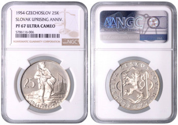 25 Kčs 10. Výročí Slovenského národního povstání, 1954, Kremnica. MCH CSR2P-010 PROOF , NGC PF 67 ULTRA CAMEO