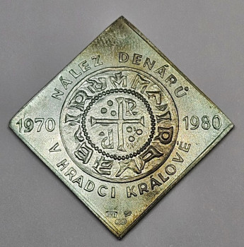 10. výr. nalezení denárů v HK 1970-1980, klipa 25x25 mm., punc Ag 900/1000, 9 gr., poč. patina + inf.leták (certfikát)