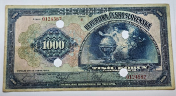 1000 Kčs 1932 - SPECIMEN SERIE C - 4 Skartační otvory - R! Stav viz.foto - přeložená! ale vzácnější!