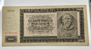 1000 Kčs 1942 - SPECIMEN vodorovně série Dc - stav mezi N a 1/1