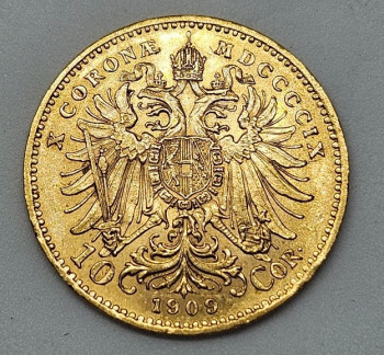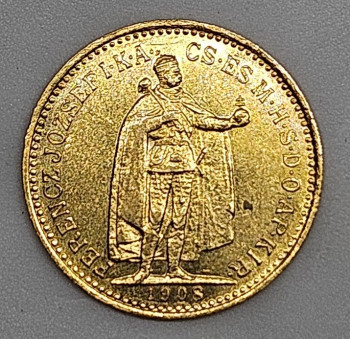 10 Koruna 1908 K.B. Kremnica Uherská ražba - Au/Zlato 900/1000, 19mm, 3,387g