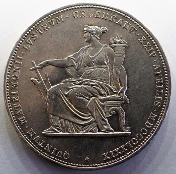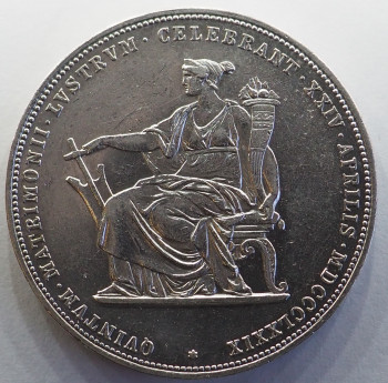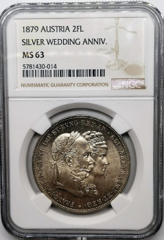 2 Zlatník Svatební 1879 - František I. a Alžběta - SISI - Rok 1879 - Stříbro 900/1000 24,69g hrana hladká s nápisem ZWEI GULDEN. XLV.KÉT FORINT, autoři Josef Tautenhayn, Anton Scharff, Friedrich Leisek