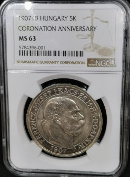5 Koruna Korunovační 1907 NGC MS63 - originální ražba - vysoké hodnocení 36mm, Ag 900/1000, 24g - Certifikace NGC MS63 - vysoké hodnocení
