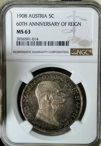 5 Koruna 1908 Jubilejní k 60 letům vlády FJI TOP STAV MS 63! Mimořádná zachovalost!