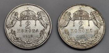 Sestava Uherská Andělíčková 2 Koruna 1912 a 1913 -)) Každá mince Ag 835/1000, 10g, 27mm, hrana s nápisem VIRIBVS VNITIS