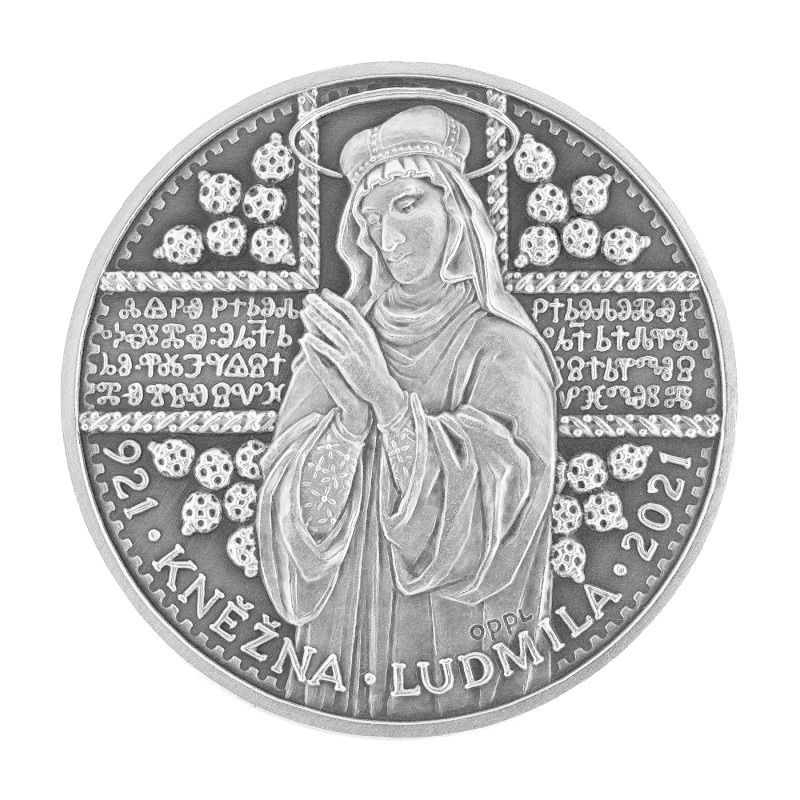 Averz stranu ztvárnil ak. sochař a medailér Vladimír Oppl jako poctu lidskosti svaté Ludmily. Je zde zpodobněna jako silná, pokorná a pevně věřící žena. Tyto její vlastnosti jsou vyjádřeny sepjatýma rukama a výrazem obličeje.