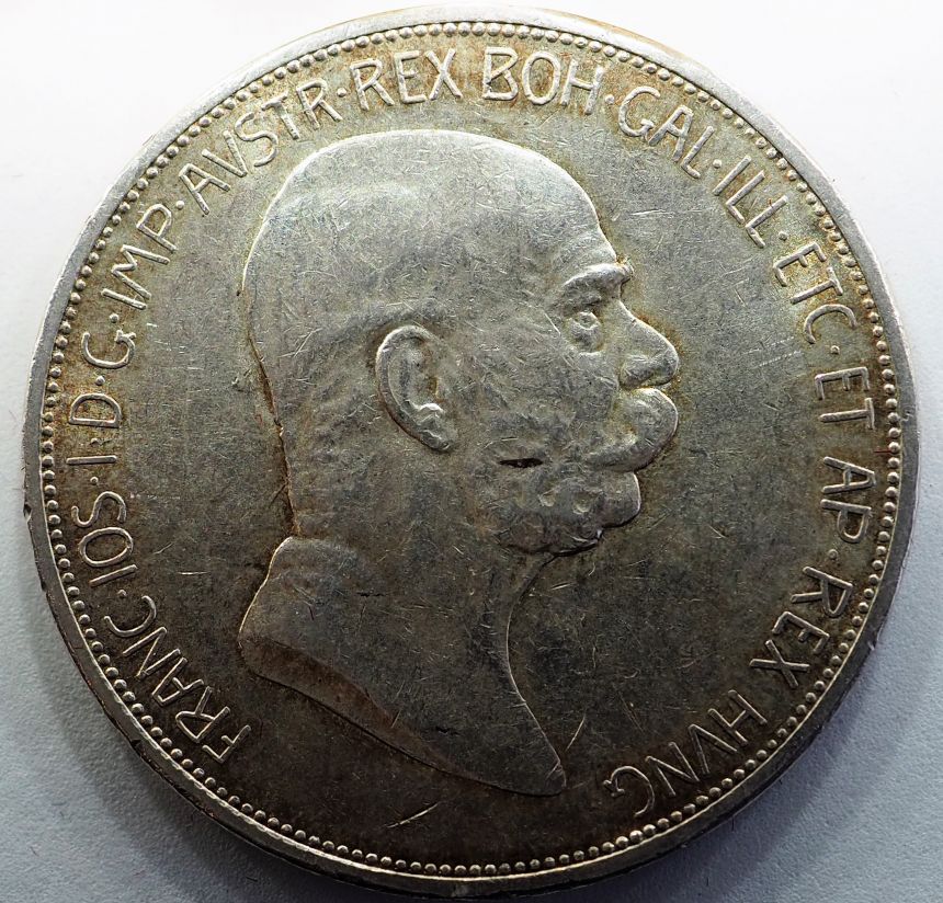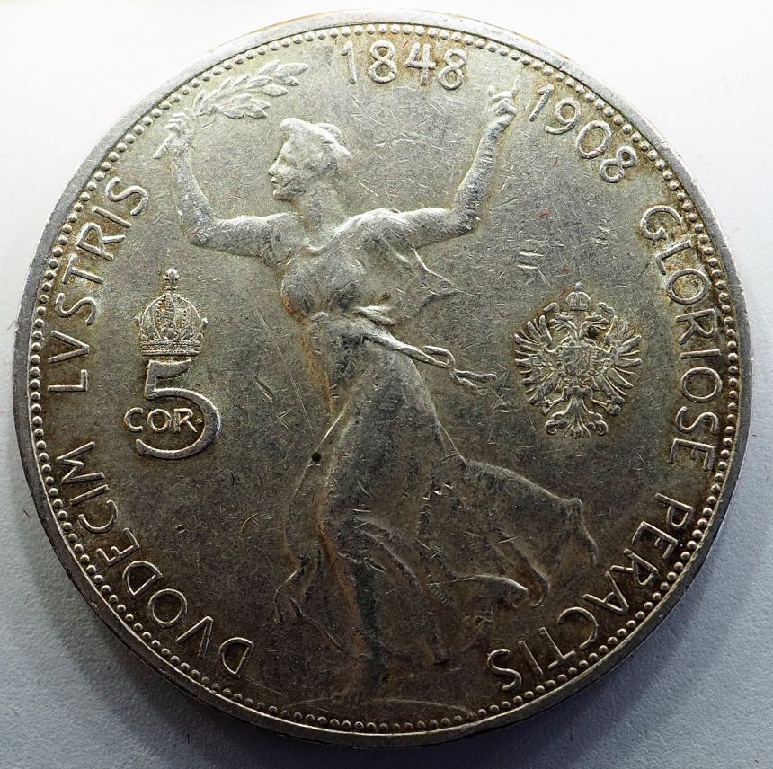 5 Koruna 1908 Jubilejní k 60 letům vlády FJI Ag 900/1000, 36mm, 24g, hrana hladká s nápisem VRIBVS VNITIS (spojenými silami)
