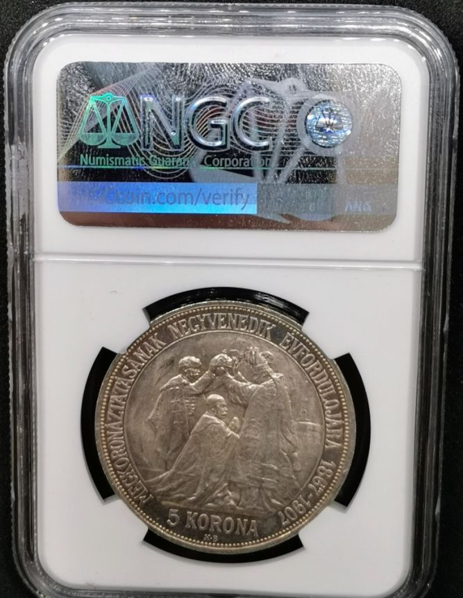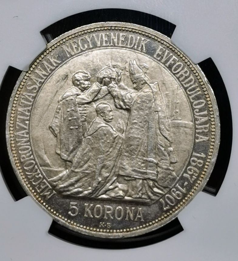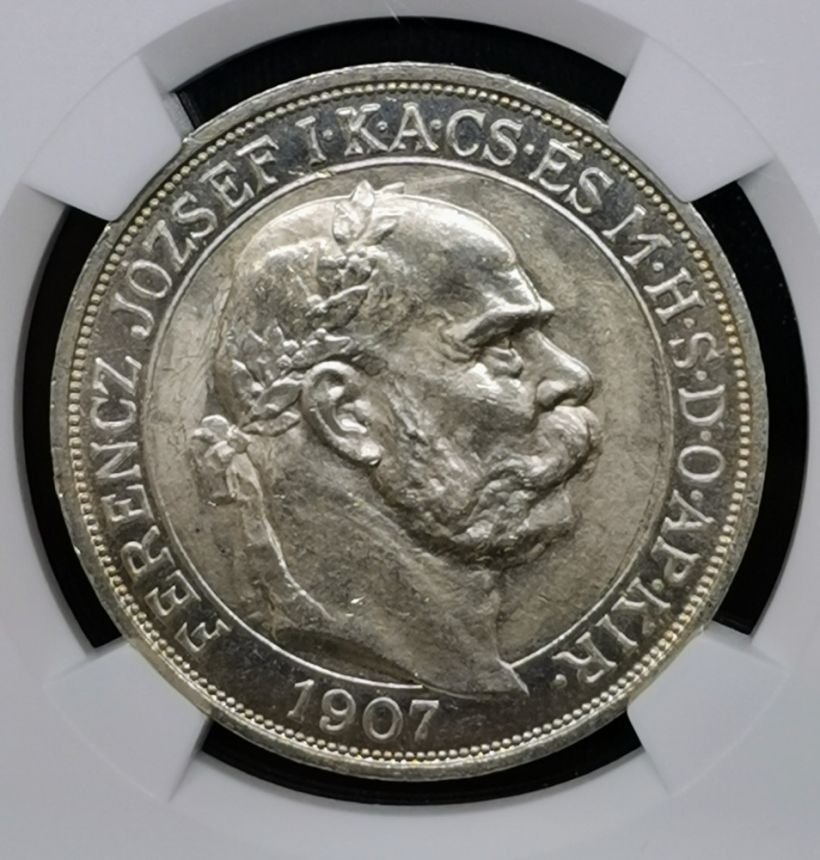 5 Koruna Korunovační 1907 NGC MS63 - originální ražba - vysoké hodnocení 36mm, Ag 900/1000, 24g - Certifikace NGC MS63 - vysoké hodnocení