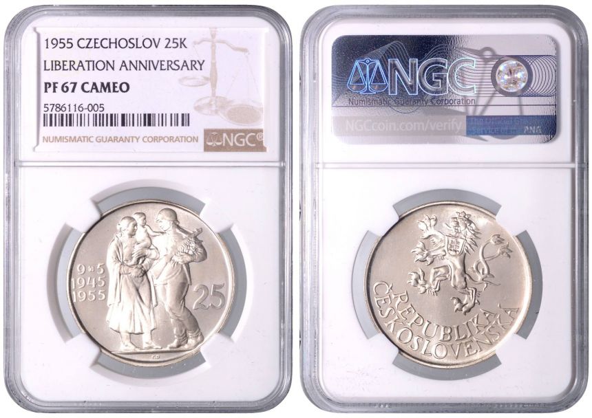 25 Kčs 10. Výročí osvobození Československa, 1955, Kremnica. MCH CSR2P-012 PROOF , NGC PF 67 CAMEO
