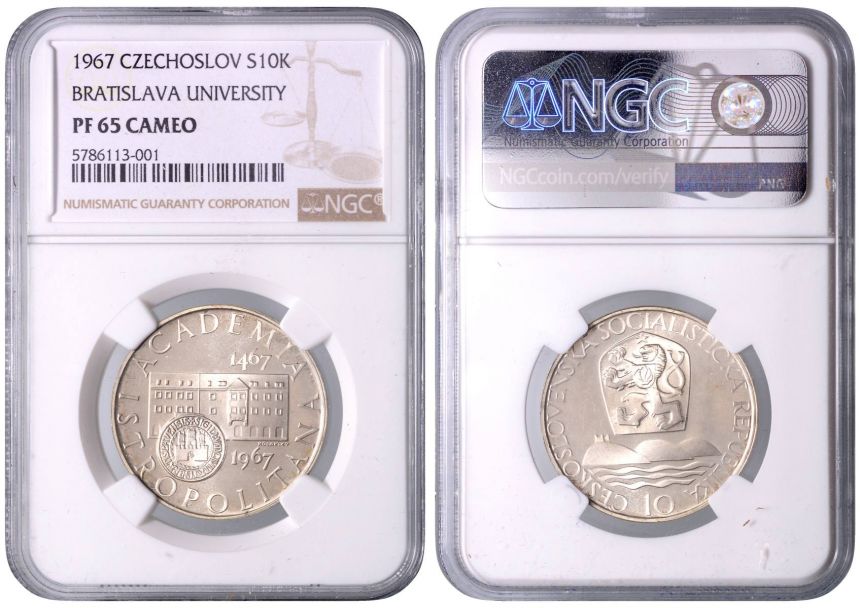 10 Kčs Academia Istropolitana, 1967, Kremnica. MCH CSSRP-005 PROOF , NGC PF 65 CAMEO
