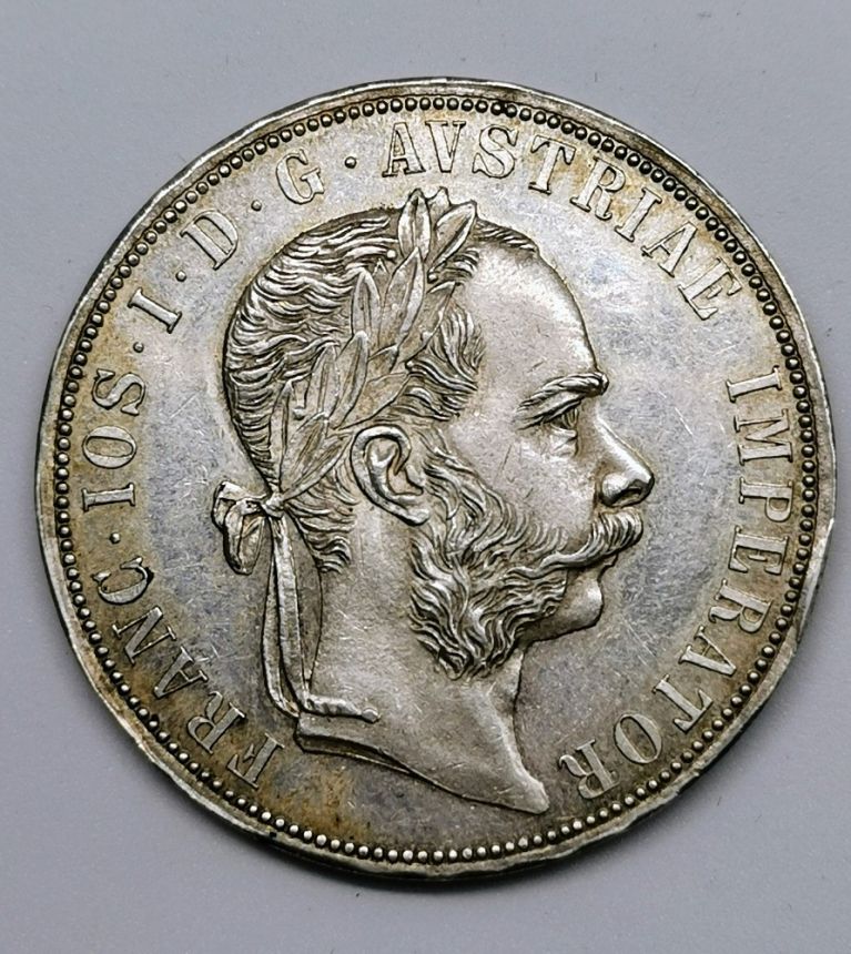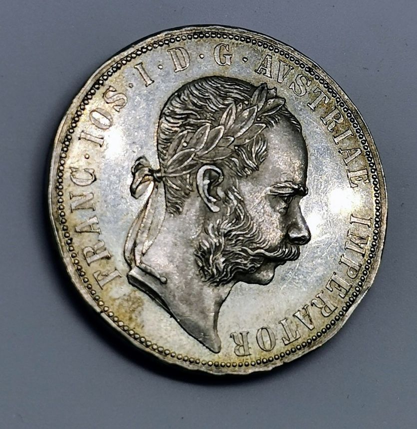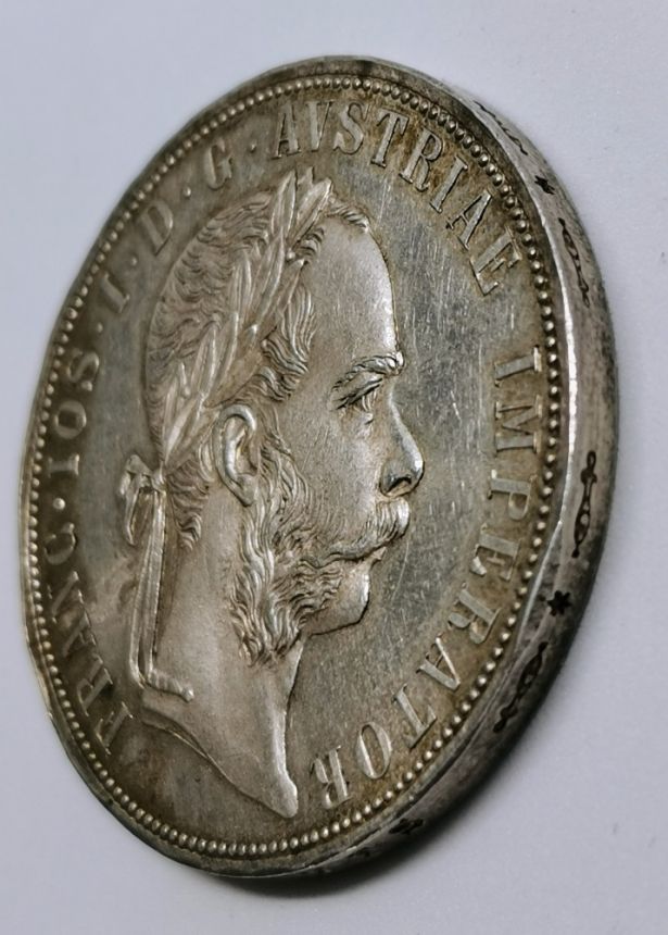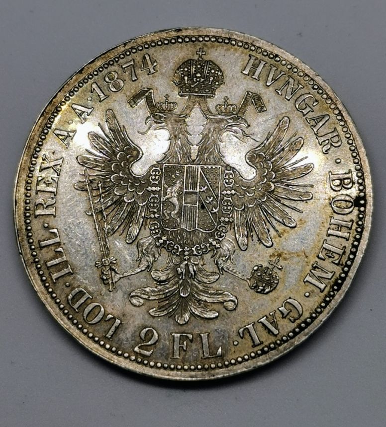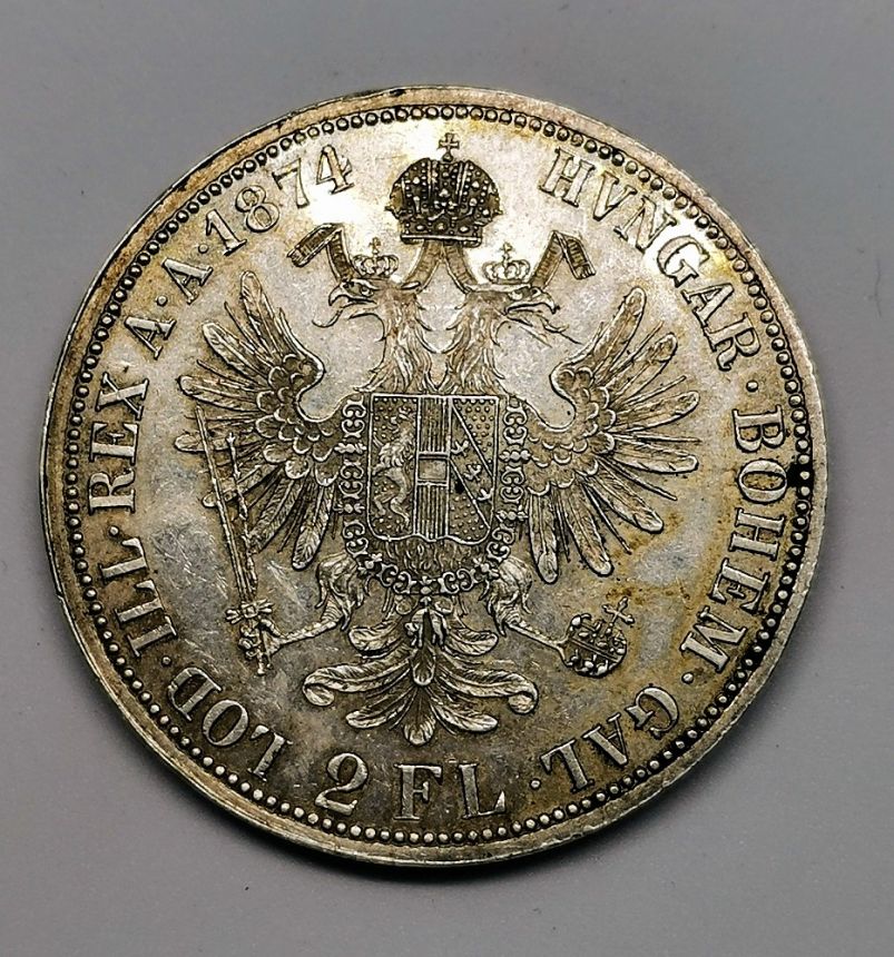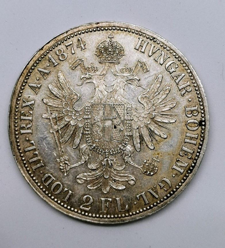 2 Zlatník 1874 - krásný STAV Ag 900/1000, 36mm, 24,691g, hrana hladká s nápisem VIRIBVS VNITIS