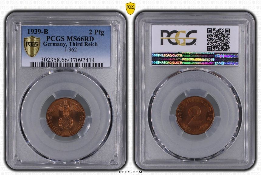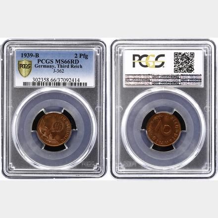 Německo - Třetí říše 2 Reichspfennig 1939 B PCGS MS66 - TOP POP R!