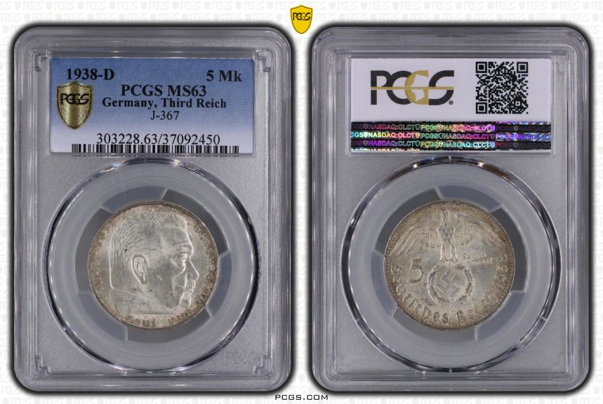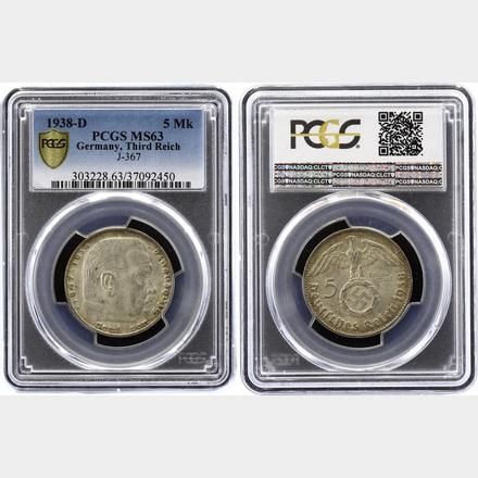 Německo - Třetí říše 5 Reichsmark 1938 D PCGS MS63