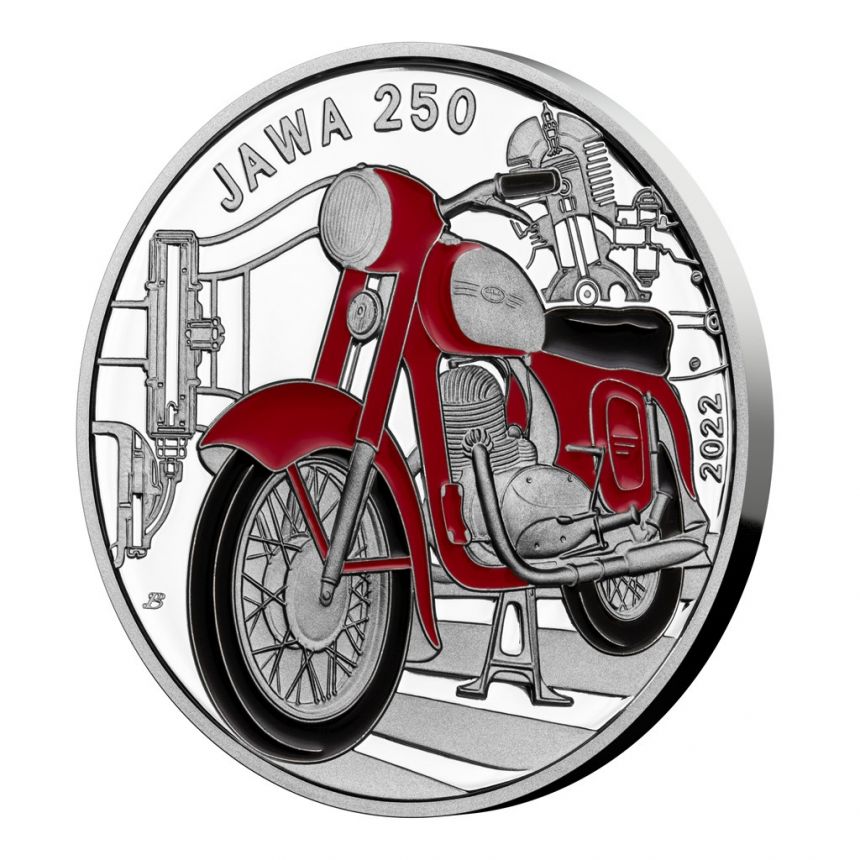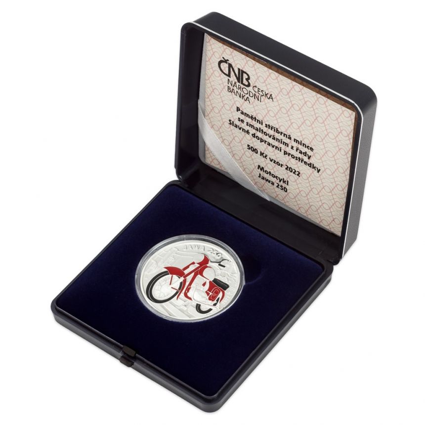 Pětiletý cyklus stříbrných mincí České národní banky s nominální hodnotou 500 Kč, který připomíná slavné dopravní prostředky, představuje svou druhou emisi. Mince s letopočtem 2022, která byla vyražena v provedení proof, je věnována motocyklu JAWA 250 typ 353.