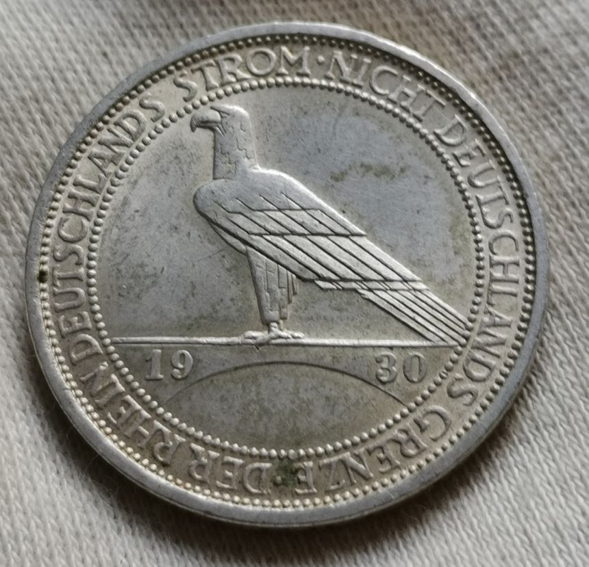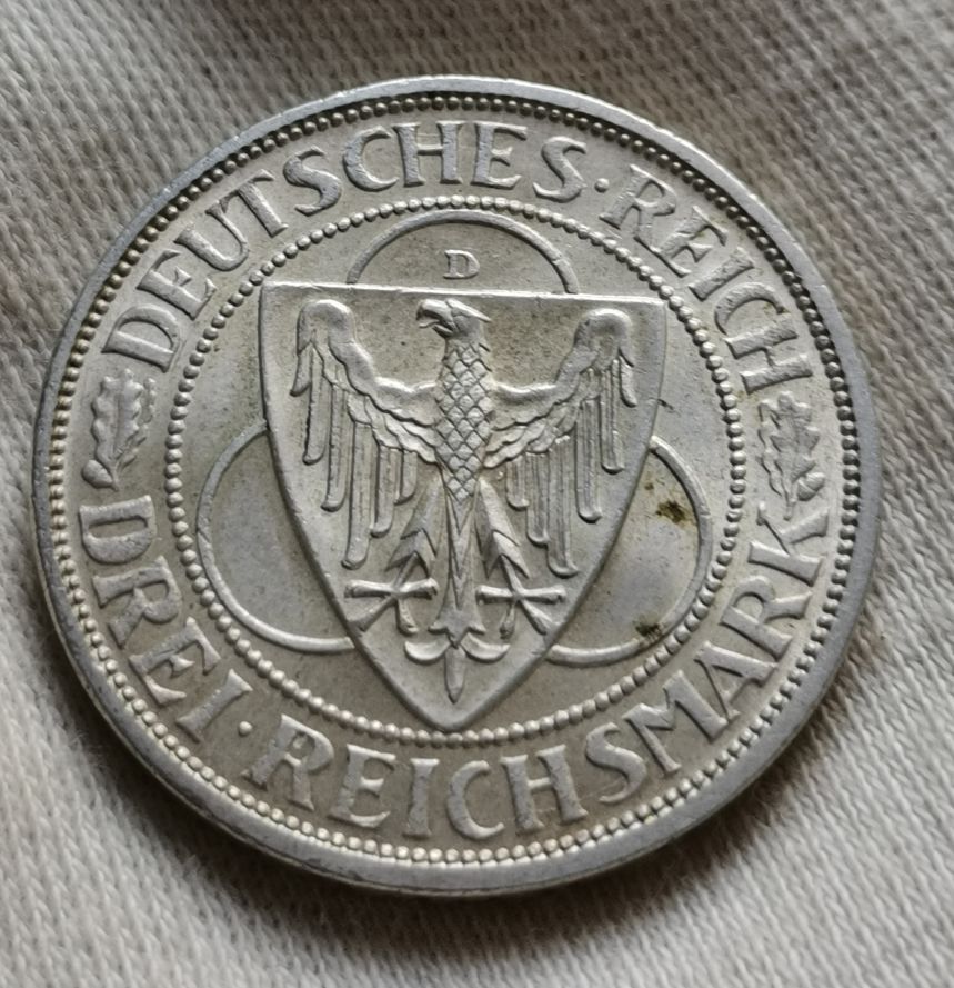 3 Reichsmarka 1930 D - Pták na mostě - 30mm, 15gramů, Ag 500/1000