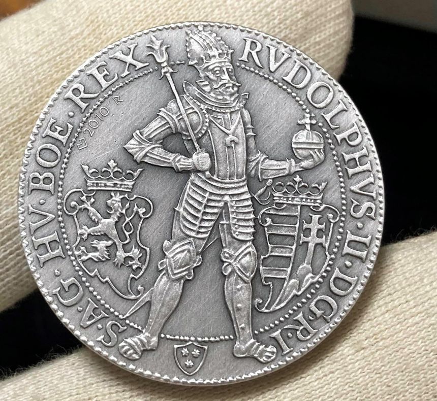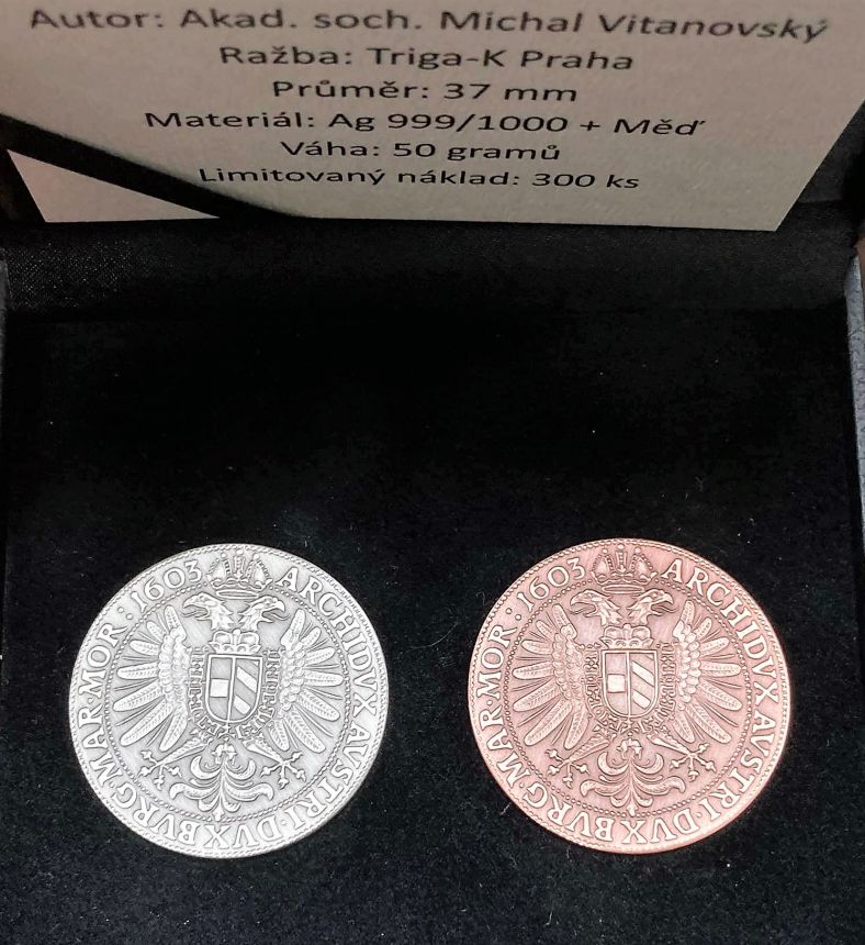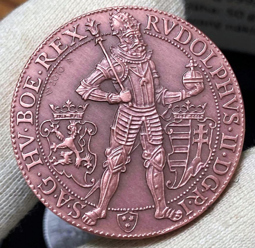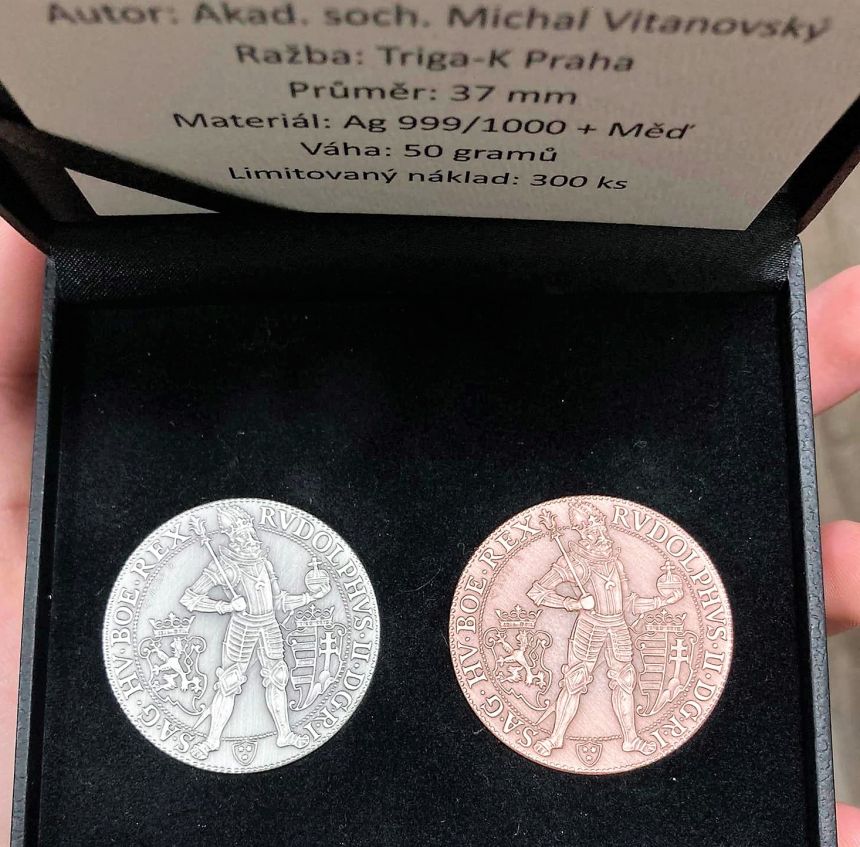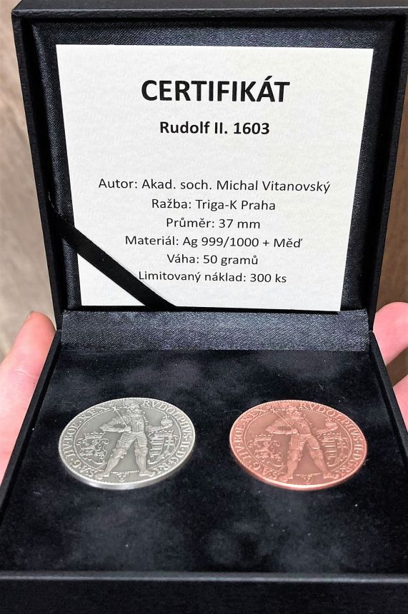 TOP AKCE Stříbrná a měděná mediale Rudolf II. (motiv 10-ti dukátu 1603) - matná. Náklad pouhých 300 kusů, Průměr: 37 mm Materiál: Ag 999/1000 + měď Hmotnost: 50g (Ag) + 37g (měď) Puncováno na hraně, Autor modelu: Michal Vitanovský 2010 + certifikát, etue