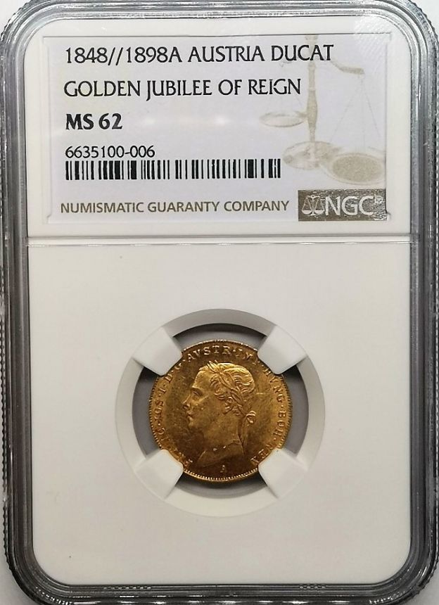 Dukát k 50 výročí nastoupení vlády FJI 1848A/1898 - NGC MS62 Au 0,986, 19,8mm, 3,491g, hrana vroubkovaná, jubilejní (pouze 26.000 ks),