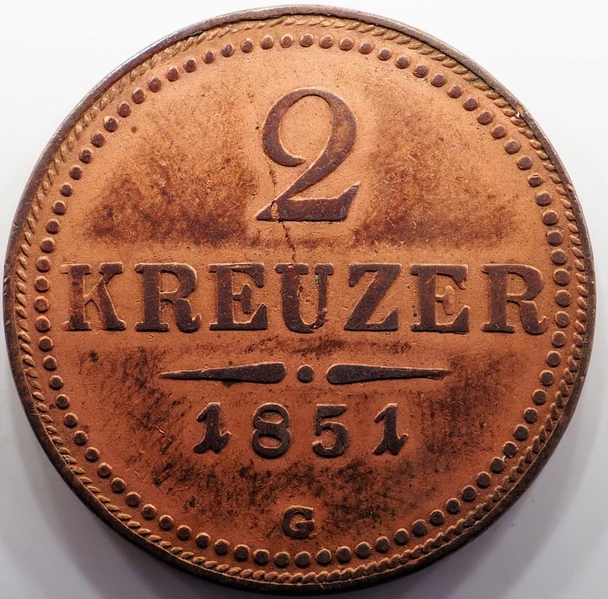 2 Krejcar 1851 G, Cu, 26mm, Františka Josefa I./varianta malé G RRR!
