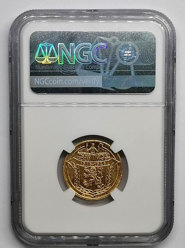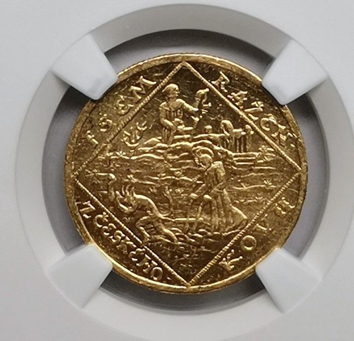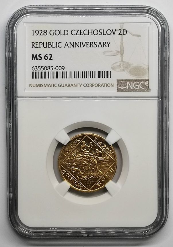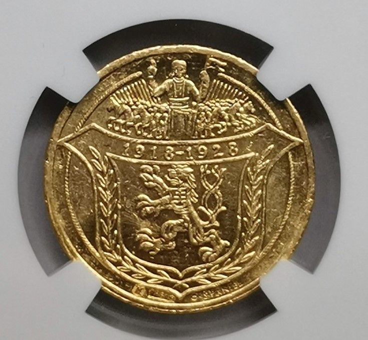Dvoudukátová Au medaile Jsem ražen s Českého kovu - NGC MS62 - 1928 (O. Španiel) - 10. výročí vzniku republiky. Český lev ve štítě, nad ním kníže Václav v čele Blanických rytířů / Sv. Prokop orá s čertem. Au 22 mm (6,89 g)