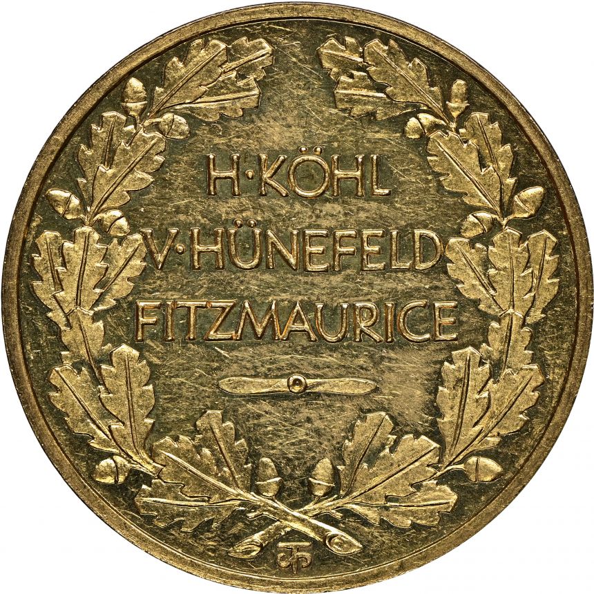 Zlatá medaile z roku 1928 T. Schwaba za let přes oceán „Brémy“ z východu na západ.