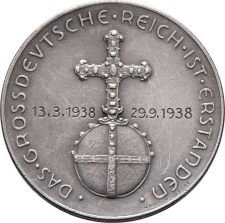 Hanisch - připojení Rakouska a Sudet k Říši 1938 - hlava A.Hitlera zprava, opis / říšské jablko, písmo, Sign., patinované Ag835, 36mm, 21.458g, nep.rysky