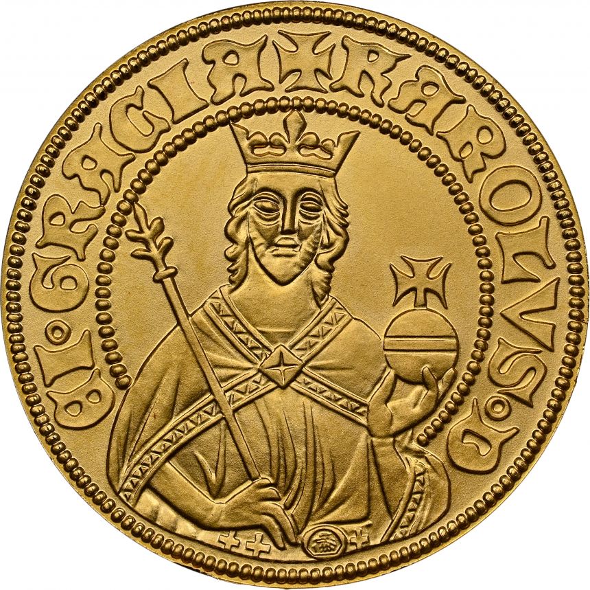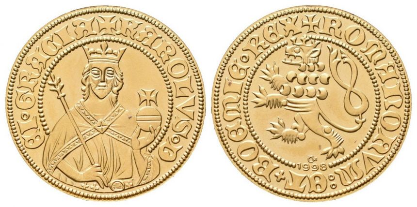 Nejstarší český dukát vyražený u příležitosti 620. výročí úmrtí Otce vlasti První zlatou českou minci, tzv. florén Jana Lucemburského nahradila na počátku vlády Karla IV. nejstarší česká dukátová ražba. Na rozdíl od florénu nesla ve svých obrazech poprsí panovníka na jedné a českého lva na druhé straně. Karel IV. razil dva typy dukátů. První, královský, jež je reprezentován i touto replikou, nese vyobrazení mladého bezvousého panovníka s královskou korunou, druhý, tzv. císařský, znázorňuje panovníka vousatého s korunou císařskou. Vzorem dukátových ražeb byly italské ražby zvané zecchino nesoucí zkrácený opis „Sit tibi Christe datus quem tu regis iste ducatus – SITTXTEDATQTVREGISISTEDVCAT“. Název mince vznikl z posledního slova opisu. Dukátové ražby se pro svou vysokou ryzost (23 1/2 karátu) a stabilní hmotnost (3,5 g) záhy staly základním zlatým nominálem ve většině zemí Evropy. Český dukát však pro nedostatek domácí suroviny nedosáhl takového rozšíření jako například dukát uherský.