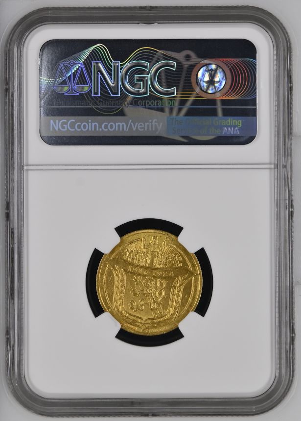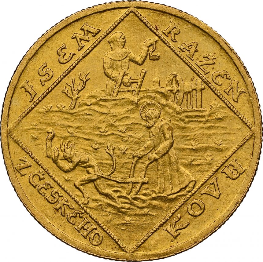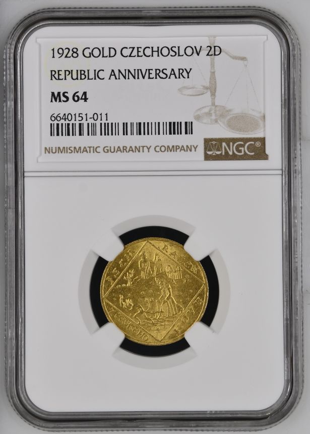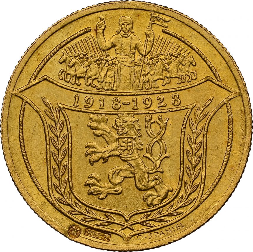 Dvoudukátová Au medaile Jsem ražen s Českého kovu - NGC MS64 - 1928 (O. Španiel) - 10. výročí vzniku republiky. Český lev ve štítě, nad ním kníže Václav v čele Blanických rytířů / Sv. Prokop orá s čertem. Au 22 mm (6,89 g)