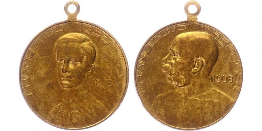 AE Medaile 1908 - K 60. výročí panování. Mladé poprsí zleva, opis / Staré poprsí zleva, opis. Pozlac. Br 29 mm, pův. ouško