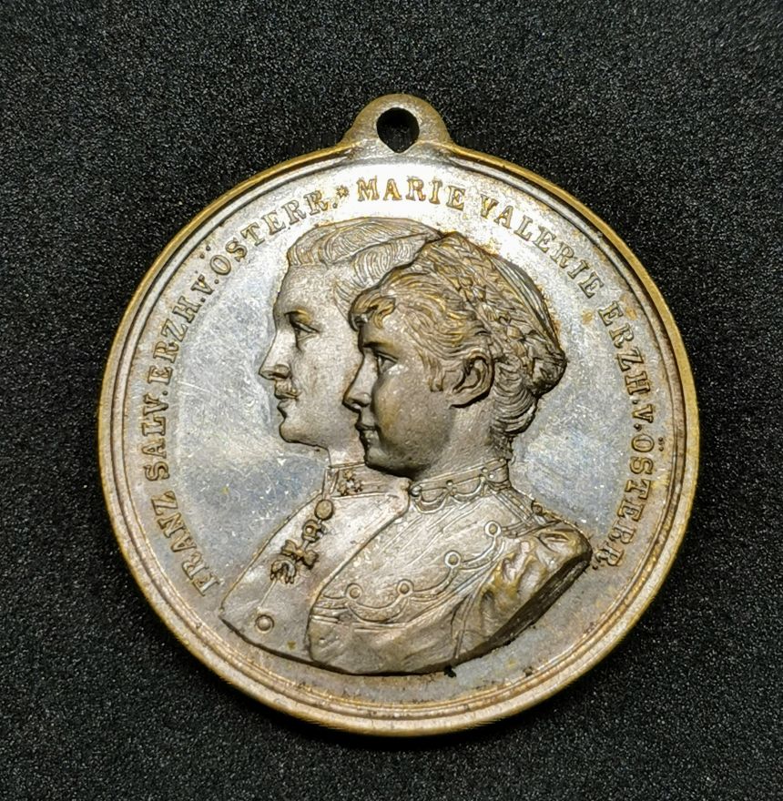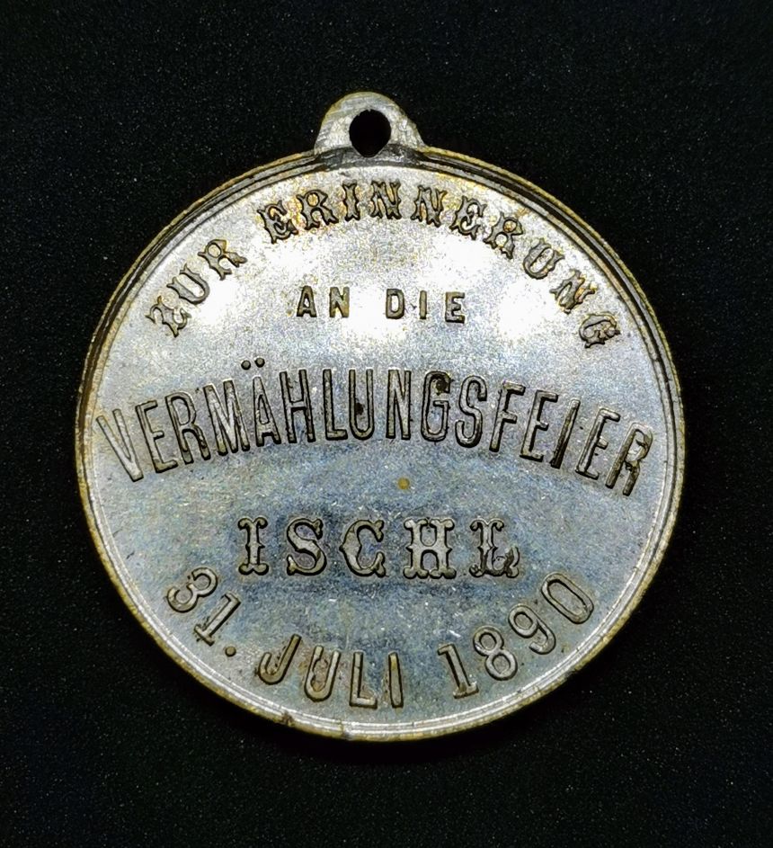 Arcivévoda František Salvator a Av. Marie ValérieScharff - medailka na svatbu v Ischlu 31.VII.1890 - dvojportrét zleva, opis / 5-řádkový nápis, Nesign., postříbřený bronz 30 mm s původním raženým ouškem