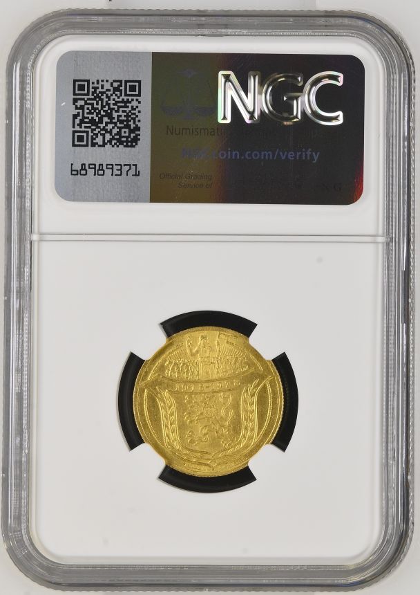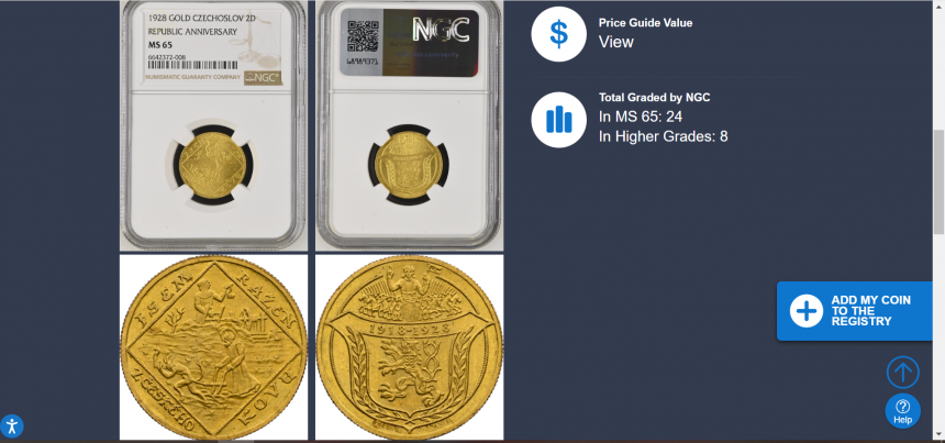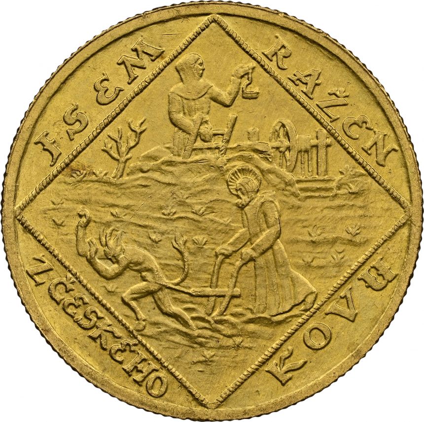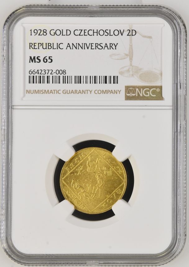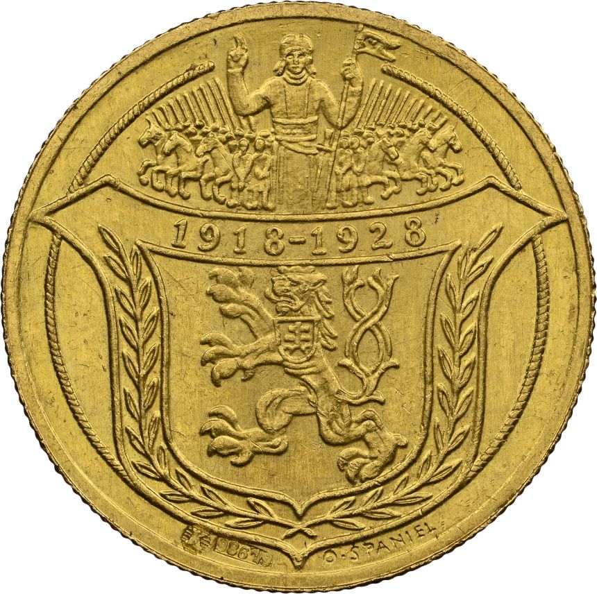 Dvoudukátová Au medaile Jsem ražen s Českého kovu - NGC MS65 - 1928 (O. Španiel) - 10. výročí vzniku republiky. Český lev ve štítě, nad ním kníže Václav v čele Blanických rytířů / Sv. Prokop orá s čertem. Au 22 mm (6,89 g)