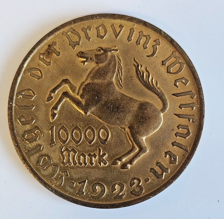 10000 Marka 1923 Westfálsko Pozlacená měď, 45mm, 31g - pěkná