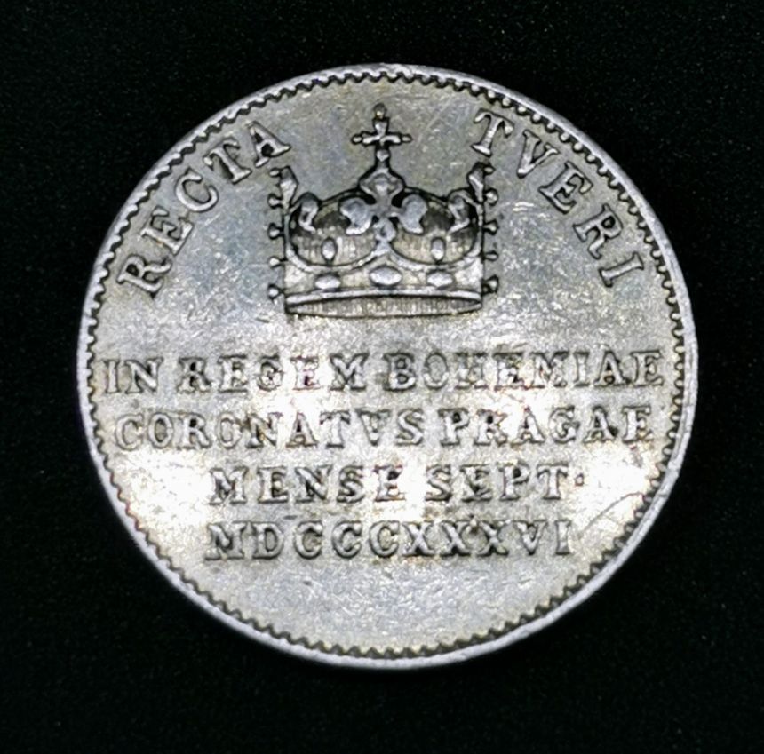 Ferdinand V. - AR Malý žeton 1836 - Ke korunovaci na českého krále 7. 9. 1836 v Praze. Hlava Ferdinanda I. zprava, opis / Česká koruna, pod ní 4-řádkový nápis. Ag 18 mm (3,28 g)