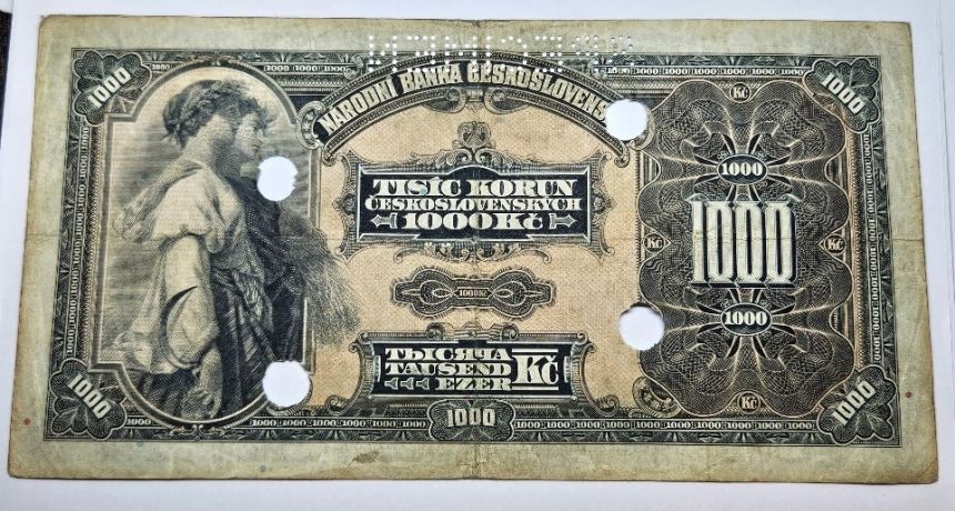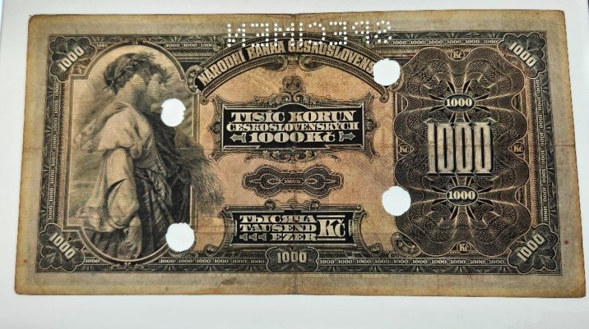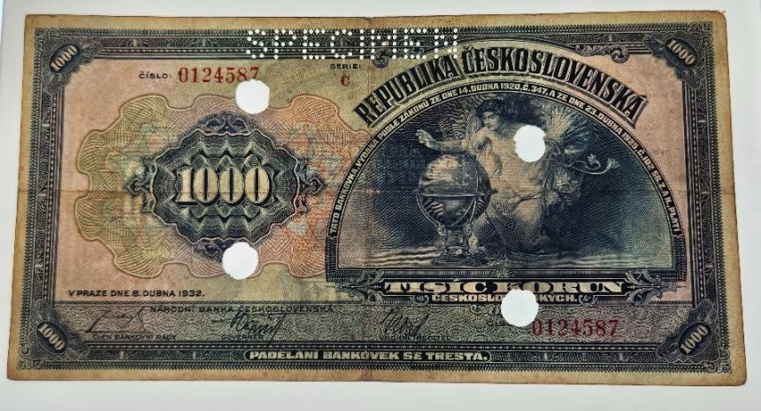 1000 Kčs 1932 - SPECIMEN SERIE C - 4 Skartační otvory - R! Stav viz.foto - přeložená! ale vzácnější!