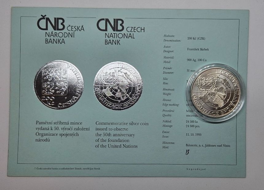 ČNB 200Kč 1995 - 50. výročí založení OSN - 31mm, 13g, Ag 900/1000, B.K. - mince v plastové etue+certifikát viz.foto.