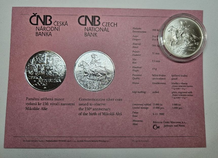 ČNB 200Kč 2002 - 150. výročí narození Mikoláše Alše , 31mm, 13g, Ag 900/1000, B.K. - mince v plastové etue+certifikát viz.foto.
